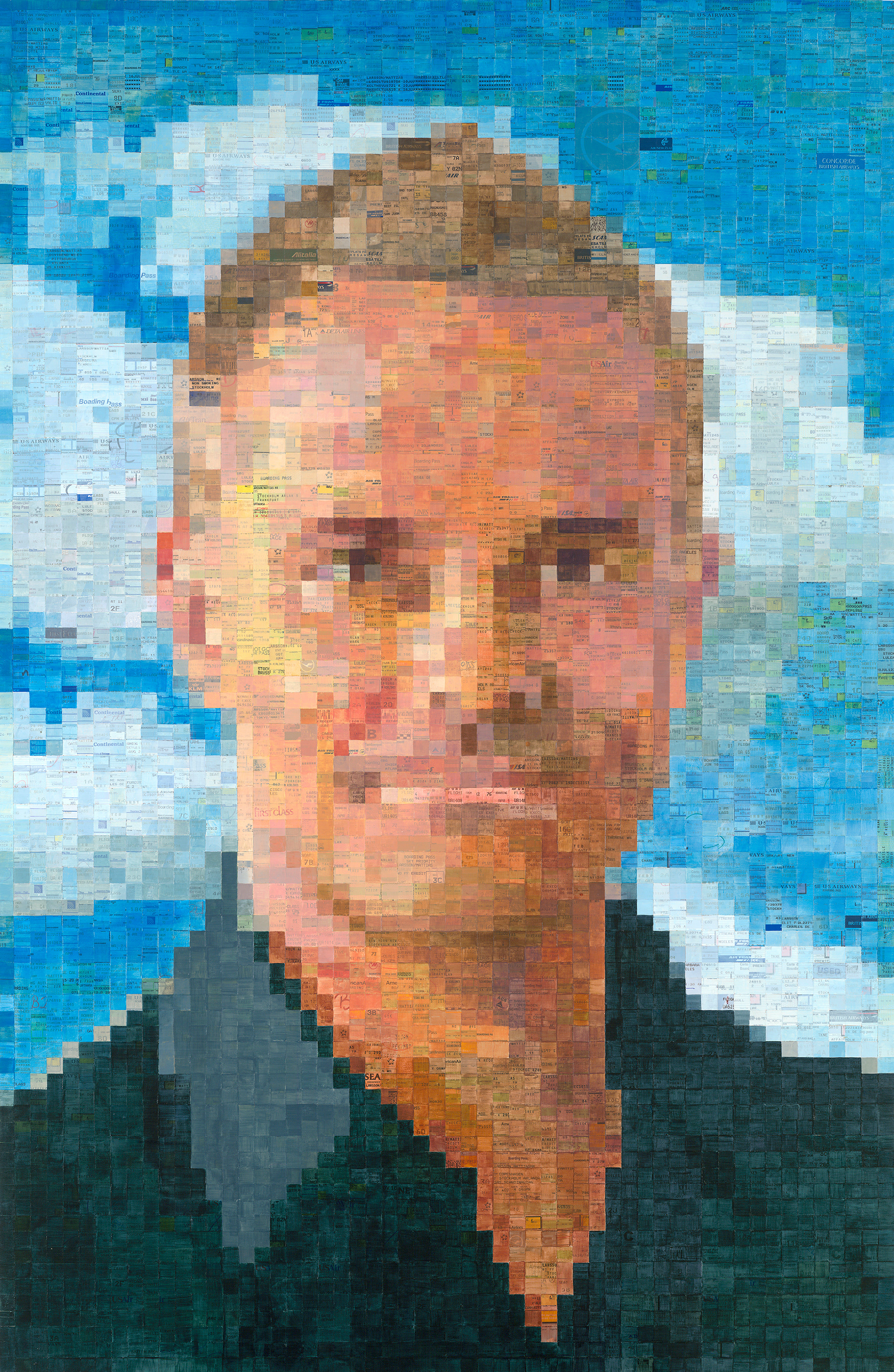 57 x 37 inches, acrylic tinted airline boarding passes on wood panel